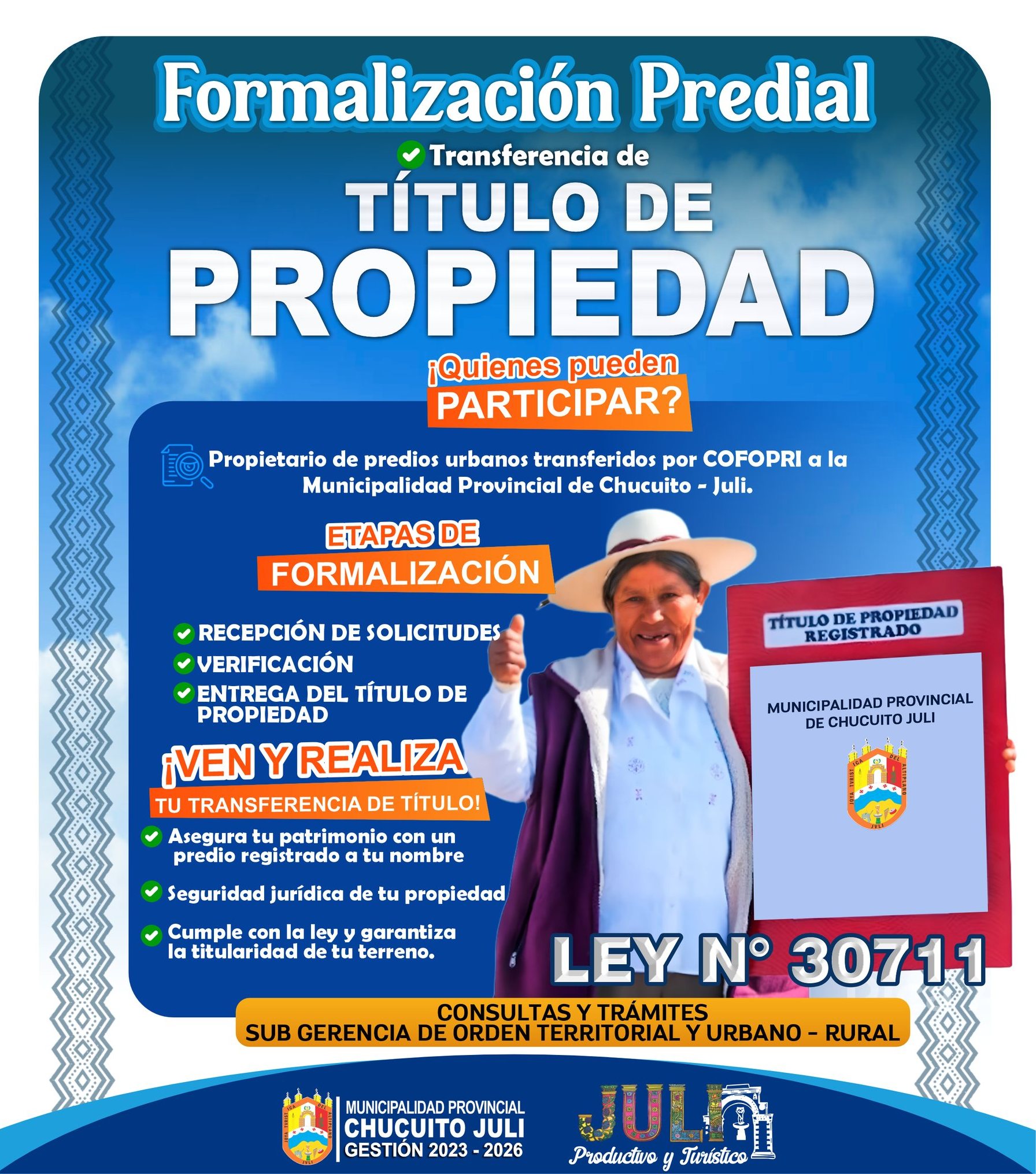 La Municipalidad Provincial de Chucuito โ Juli invita a los propietarios de predios urbanos transferidos por COFOPRI a participar del proceso de transferencia de tรญtulo de propiedad, conforme a la Ley N.ยบ 30711.