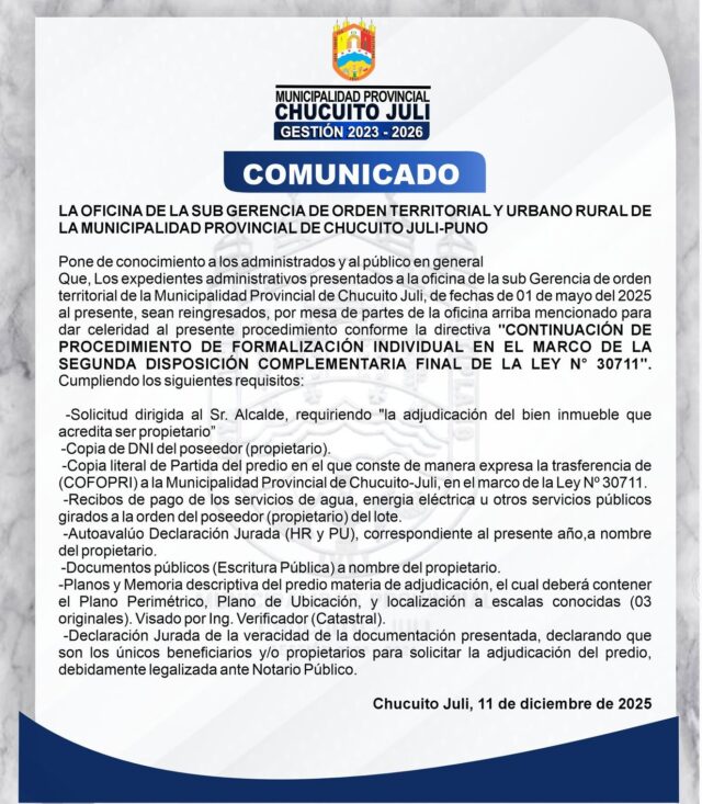 Que, Los expedientes administrativos presentados a la oficina de la sub gerencia de demarcación territorial de la municipalidad provincial de Chucuito Juli, de fechas de 01 de mayo del 2025 al presente, sean reingresados, por mesa de partes de la oficina arriba mencionado para dar celeridad al presente procedimiento conforme la directiva «CONTINUACION DE PROCEDIMIENTO DE FORMALIZACION INDIVIDUAL EN EL MARCO DE LA SEGUNDA DISPOSICION COMPLEMENTARIA FINAL DE LA LEY N° 30711″…