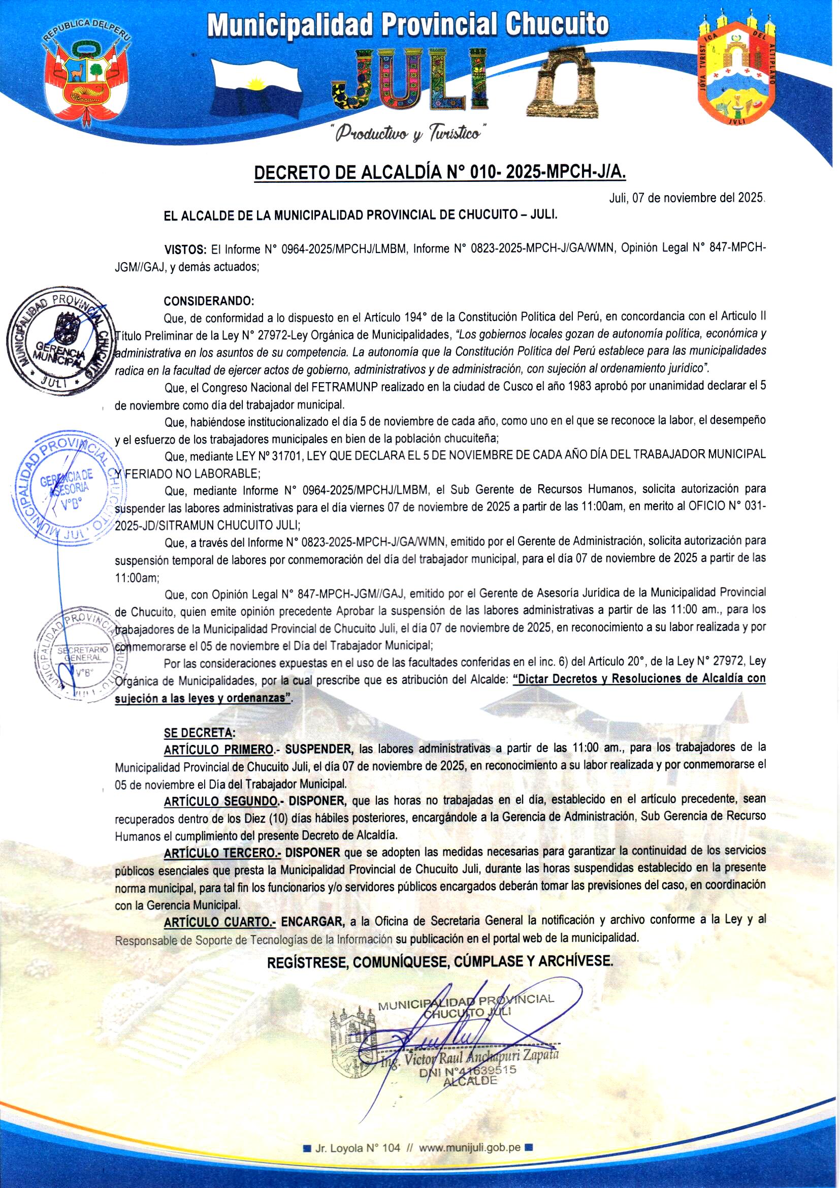 ARTICULO PRIMERO. SUSPENDER, las labores administrativas a partir de las 11:00 am., para los trabajadores de la Municipalidad Provincial de Chucuito Juli, el dia 07 de noviembre de 2025, en reconocimiento a su labor realizada y por conmemorarse el 05 de noviembre el Dia del Trabajador Municipal.